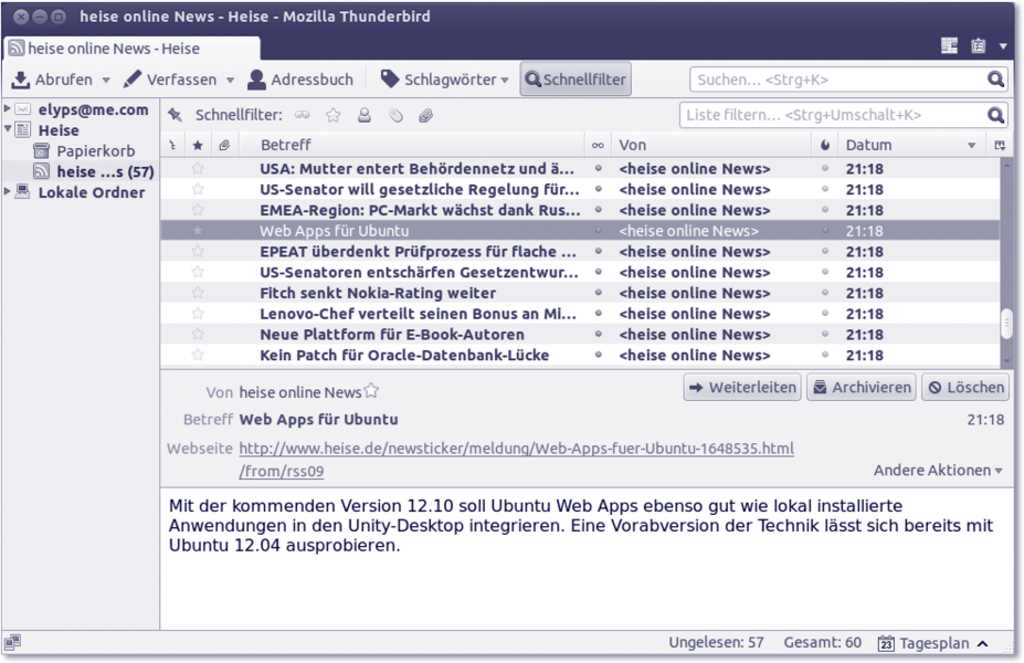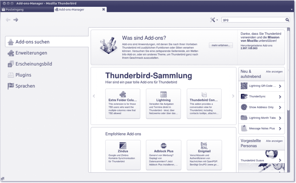 Der Mozilla-Mailclient Thunderbird ist ebenso populär wie der Firefox-Browser aus dem gleichen Hause. Thunderbird ist standardmäßig installiert und hat hier inzwischen Evolution ersetzt.