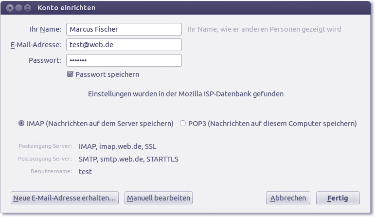 Bei der neuesten Version von Thunderbird haben Sie sogar die Möglichkeit, eine neue E-Mail-Adresse anzulegen. Diese Funktion ist relativ neu, und die Zuverlässigkeit lässt noch stark zu wünschen übrig. Der Dienst soll aber in weiteren Versionen deutlich ausgebaut werden.