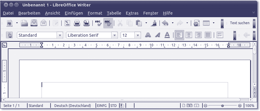 Nach dem Start des Programms über Anwendungen • Büro • LibreOffice Writer sollte automatisch ein leeres Dokument geöffnet werden. Aus der Office-Umgebung heraus kann das durch den Menüpunkt Datei • Neu • Textdokument geschehen.