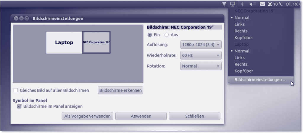 Abbildung 9.7 Das Anschließen eines externen Monitors oder Beamers ist erheblich leichter geworden. Über das Panel-Applet ist das Umschalten zwischen den Monitoren blitzschnell erledigt.