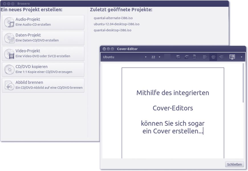 Alle Funktionalitäten von Brasero sind nahezu selbsterklärend. Die Oberfläche ändert sich nicht – egal ob Sie Musik, Daten oder Videos brennen möchten. Die Technik tritt hinter dieses Ziel zurück. Erwähnenswert ist der Cover-Editor, den Sie unter dem Menüpunkt Werkzeuge finden. Mit diesem Editor können Sie auf einfache Weise Hüllen für Ihre Medien erstellen.