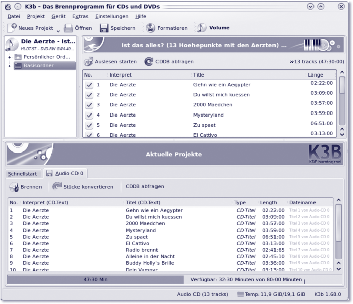 Möchten Sie bei Audio-CDs die Titel der Tracks angezeigt bekommen, so müssen Sie sicherstellen, dass Ihr Computer mit dem Internet verbunden ist, da hierfür ein Zugriff auf die CDDB-Datenbank für Musiktitel erforderlich ist (siehe Abbildung 11.5). Zusätzlich muss im Konfigurationsmenü unter CDDB der Zugriff auf einen Server konfiguriert werden. Der eigentliche Brennvorgang wird dann über Projekt • Brennen initiiert. Im Falle einer Daten-CD oder -DVD haben Sie im Brenndialog bzw. dessen Untermenü Einstellungen auch die Möglichkeit, eine Multisession-CD oder -DVD zu beginnen. Dabei wird die CD oder DVD nicht finalisiert, Sie können zu einem späteren Zeitpunkt also weitere Dateien hinzufügen.