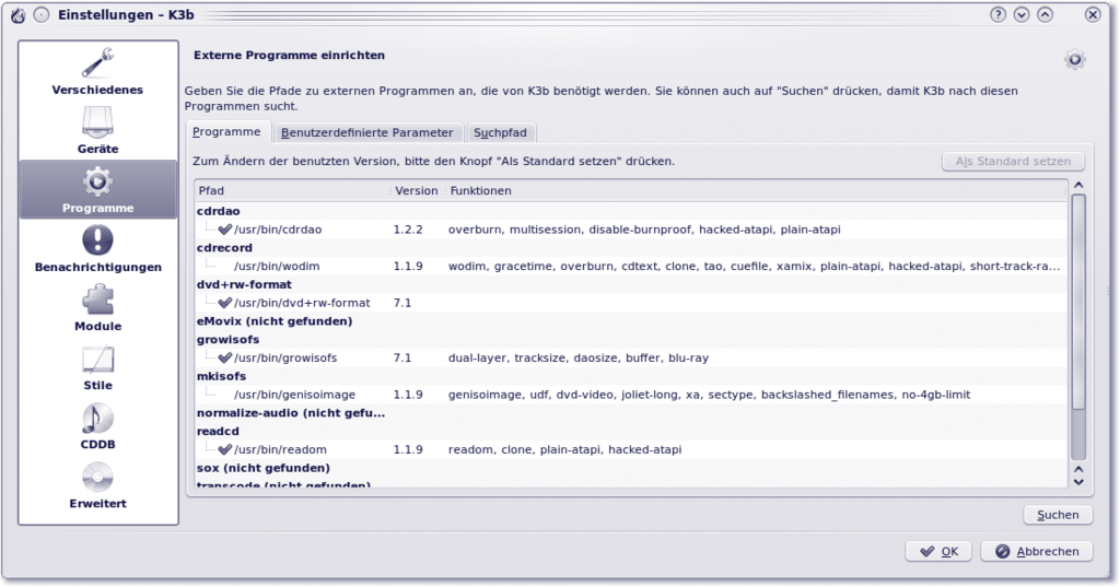 Wünschen Sie Unterstützung für das Brennen von MP3-Dateien als Audio-CD, dann sollten Sie ebenfalls das Paket k3b-mp3 installieren. Beim ersten Programmstart wird die erkannte Brennhardware angezeigt. Dies können Sie auch jederzeit im Menü Einstellungen • K3b einrichten • Geräte nachprüfen. Dort sollten Sie außerdem kontrollieren, ob sämtliche zum Brennen benötigten Kommandozeilenprogramme im System zu finden sind. Dies geschieht im Untermenü Einstellungen • K3b einrichten • Programme (siehe Abbildung 11.2.2). Beachten Sie, dass nicht unbedingt sämtliche aufgelisteten Programme installiert sein müssen; einige Tools beziehen sich zum Beispiel auf die Erstellung von Video-CDs/DVDs.
