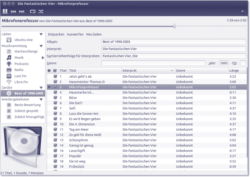 Rhythmbox ist unter Ubuntu Ihre zentrale Anlaufstelle zur Musikverwaltung. Das Programm übernimmt drei wesentliche Aufgaben:
