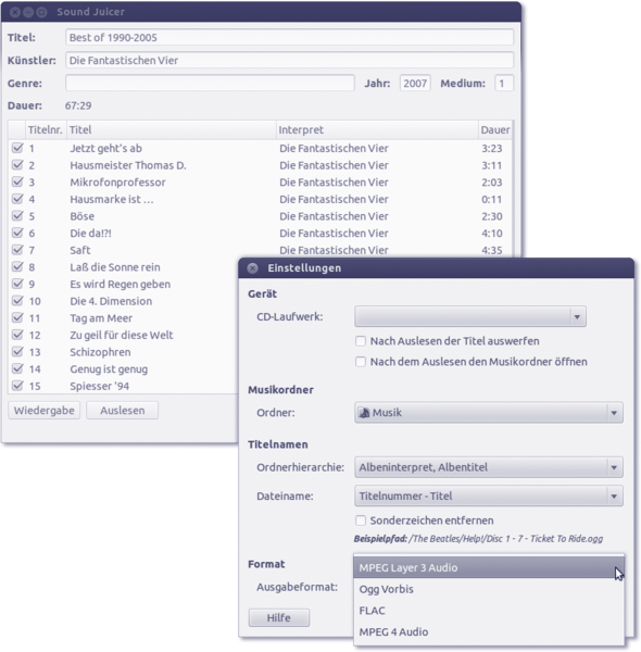 Wenn Sie MP3s erstellen möchten, müssen Sie die erforderlichen Codecs installiert haben. Am einfachsten gelingt dies durch die Installation des Metapakets ubuntu-restricted-extras. Im Anschluss können Sie über Bearbeiten • Einstellungen als Ausgabeformat CD Quality, MP3 (.mp3-Typ) auswählen.