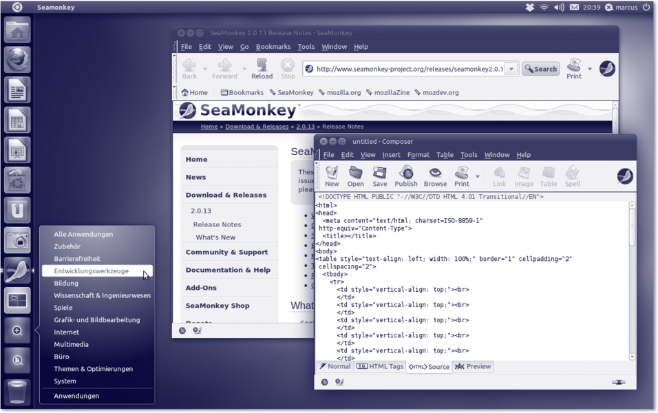 Um nun eine Website zu erstellen, starten Sie zuerst Seamonkey direkt aus dem Anwendungsmenü heraus. Unter Window • Composer öffnet sich schließlich der Composer.