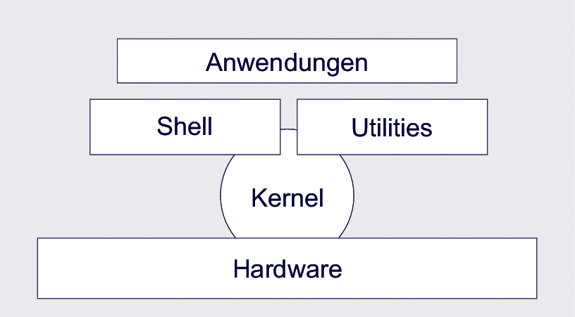 Die auf dem Kernel aufbauende Schicht besteht aus der Shell und den Utilitys. Die Shell ist hierbei das Fenster, durch das Sie das System beobachten und beeinflussen können. Die Shell ist die Schnittstelle zwischen Ihnen als Benutzer und dem System. Die Bedeutung der Shell können Sie erkennen, wenn Sie sich die Bedeutung des Begriffs »Shell« (zu Deutsch: »Schale«) vor Augen führen – sie bildet eine Schale für den Kern.