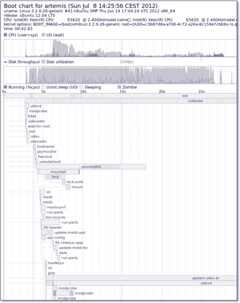 Abbildung 14.4 Die Abbildung zeigt eine Boot-chart-Analyse eines Ubuntu GNU/Linux 12.04, das mit »Upstart« hochfährt. Der Beispielrechner benötigt knapp 26 Sekunden vom Starten des Kernels bis zum grafischen Login-Manager.