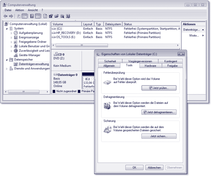 - Bevor Sie diese Partitionen verkleinern können, müssen Sie sie zunächst mit den Windows-Bordmitteln defragmentierten. Die Fragmentierung (zu Deutsch: »Zerstückelung«) der Daten tritt dadurch auf, dass das Betriebssystem die Partition nicht von vorn bis hinten auffüllt, sondern Daten-»Häppchen« über die ganze Festplatte verteilt.