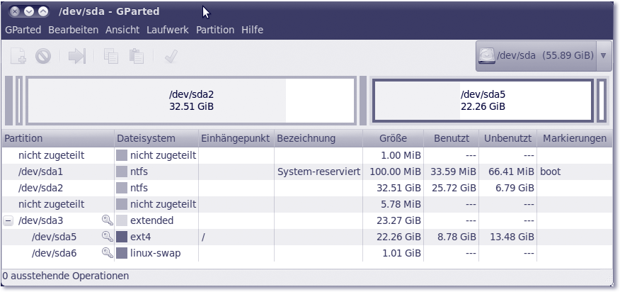 Nun wollen wir einmal genauer betrachten, wie Sie freien Platz für den Fall schaffen, dass Sie nur über eine einzige Festplatte verfügen und diese komplett partitioniert ist, also keinen unzugeordneten Speicherbereich aufweist. Bei der nachfolgenden Aktion ist allerdings Vorsicht geboten. Sichern Sie auf jeden Fall vorher Ihre persönlichen Daten auf einem Wechselmedium. Die Verkleinerung einer Partition ist zum Beispiel dann interessant, wenn Sie ein weiteres Betriebssystem auf eine (volle) Platte befördern möchten. Sie benötigen für die folgenden Arbeiten das Programm GParted (siehe Abbildung 15.5), welches Sie nach der Installation über das Anwendungsmenü starten können.