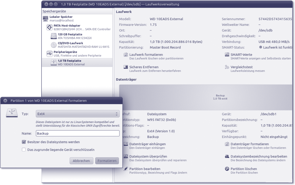 Bei den heutigen Preisen für Festplatten lohnt sich ein Streamer für die privaten Daten nicht. Stattdessen können Sie per Rsync ein Backup auf eine zweite Festplatte machen. Zuerst müssen Sie die zweite Platte einhängen: