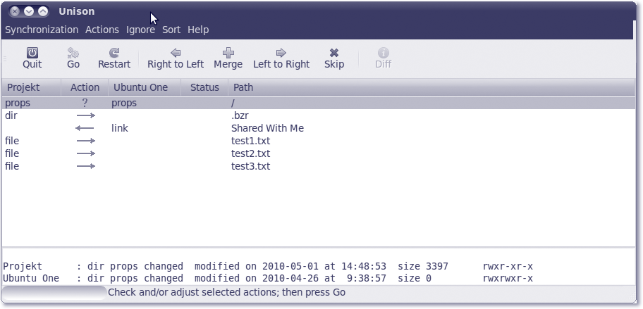 Die obige Methode mit Rsync hat den Nachteil, dass Rsync nicht besonders elegant mit Versionskonflikten umgeht. Wesentlich entspannter gelingt das Synchronisieren mit dem Programm Unison. Bei diesem Programm können Sie wahlweise sogar eine grafische Oberfläche verwenden, die Sie unter dem Namen unison-gtk in den Paketquellen finden. |