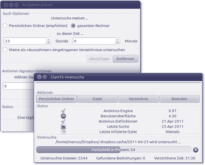 ClamTk ist eine grafische Benutzeroberfläche für den Open-Source-Virenscanner ClamAV, den Sie ganz einfach über das Software-Center bekommen. Nach erfolgter Installation können Sie den Virenscanner mit dem Befehl clamtk oder über das Anwendungsmenü (Zubehör) aufrufen.