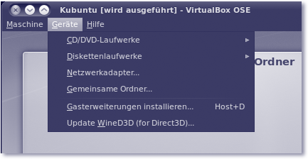 Wenn Sie Ihr Gastsystem fertig installiert haben, empfiehlt sich die Installation der sogenannten »Gasterweiterungen«. Klicken Sie dazu zunächst auf Geräte • Gasterweiterungen installieren ... (siehe Abbildung 16.12); dies führt dazu, dass im Gastsystem eine CD mit Skripten für alle unterstützten Betriebssysteme eingebunden wird.