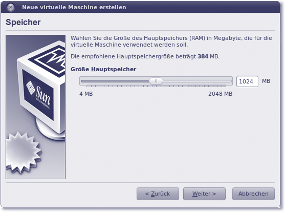 Im nächsten Fenster (siehe Abbildung 16.10) können Sie per Schieberegler Ihrer neuen virtuellen Maschine einen maximalen Anteil Ihres Arbeitsspeichers zuteilen. Sie müssen hier einen Kompromiss zwischen der Leistung des Gast- und der des Wirtsystems finden.