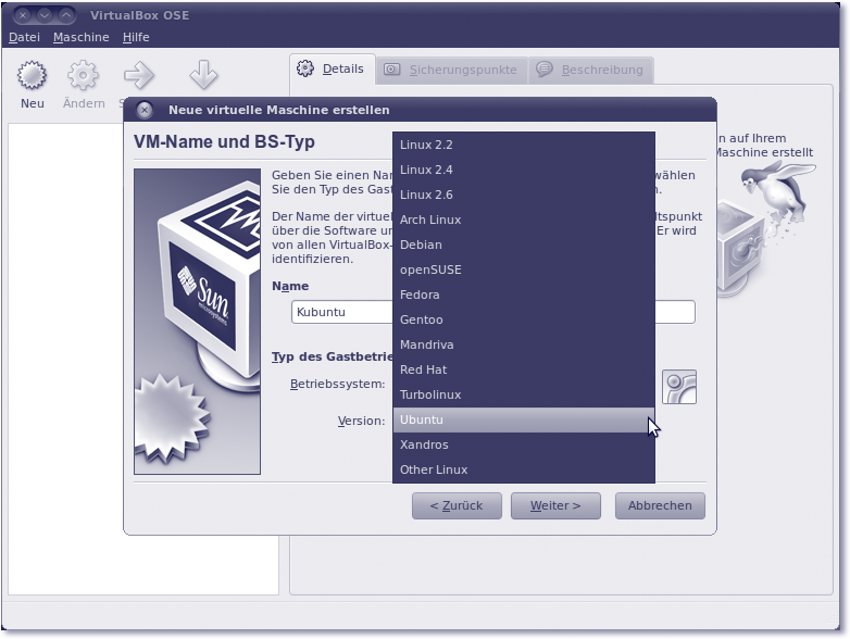 Um eine virtuelle Maschine anzulegen, klicken Sie auf Neu in der Symbolleiste am oberen Rand des Fensters. Im folgenden Dialogfenster (siehe Abbildung 16.9) vergeben Sie nun als Erstes einen Namen für Ihre neue virtuelle Maschine und wählen anschließend das gewünschte Betriebssystem und die Version, die Sie installieren wollen, aus.