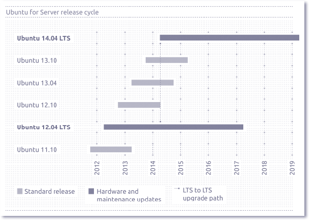 Abbildung 17.1 Der Lebenszyklus der Ubuntu-Server-Edition (Quelle: Canonical) – jede LTS-Server-Version erhält fünf Jahre garantierte Updates.