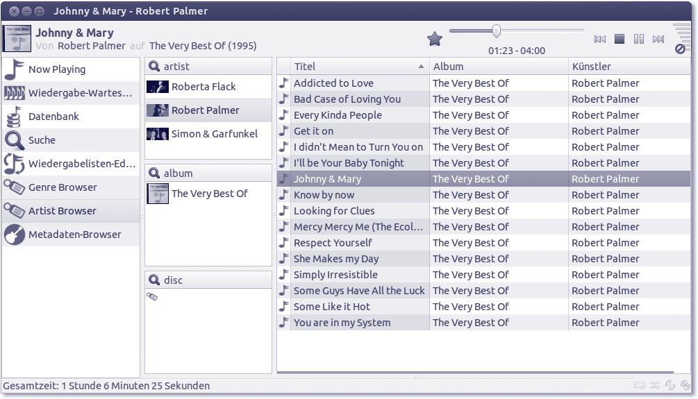 Den GNOME Music Player Client (GMPC) installieren Sie bequem über das Ubuntu Software-Center. GMPC bietet neben den grundlegenden Steuerungsfunktionen auch zahlreiche Komfortmerkmale. So finden Sie neben der Anzeige von Plattencovern und Songtexten sogar den Aufruf von Internetseiten mit Zusatzinformationen über die Künstler (siehe Abbildung 22.2).
