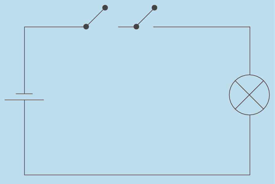 Die grundlegenden Funktionen, die im Computer stattfinden, lassen sich sehr leicht als elektrische Schaltpläne darstellen. Die beiden einfachsten Schaltungen, die man sich vorstellen kann und die sich beispielhaft durch einfaches Elektrozubehör realisieren lassen, sind die Und- sowie die Oder-Schaltung: Um diese Elemente isoliert (ohne vollständigen Rechner) zu bauen, benötigen Sie lediglich eine Batterie, eine Glühlampe, zwei Schalter und etwas Draht.