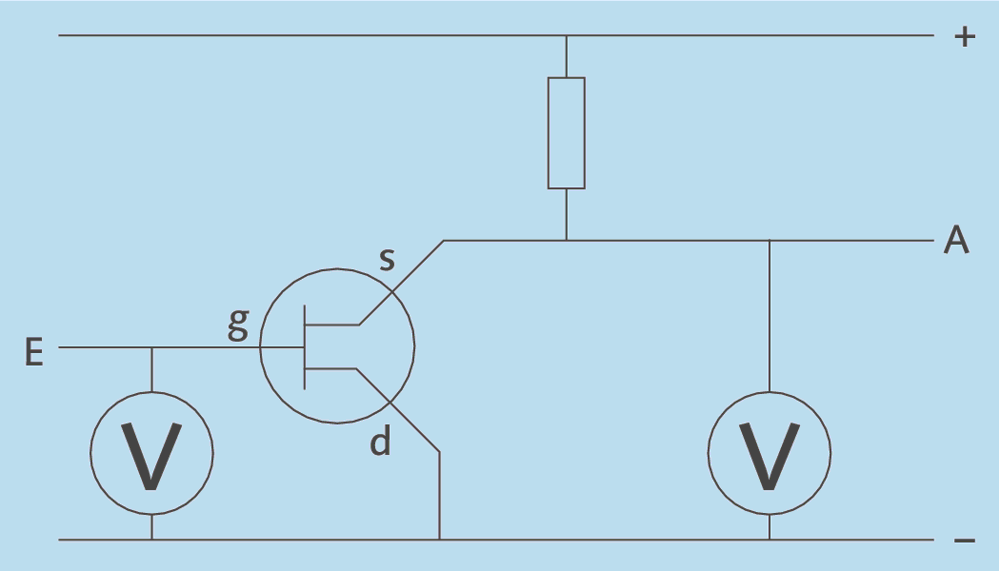 Ein MOS-Transistor (Metal Oxide Semiconductor oder deutsch: Metalloxidhalbleiter) besitzt drei Anschlüsse: einen Stromeingang (Emitter oder source), einen Stromausgang (Kollektor oder drain) und einen Steuerungseingang (gate). Es fließt nur Strom zwischen Emitter und Kollektor, wenn eine Steuerspannung anliegt, sodass sich der Transistor als Schalter betrachten lässt, der durch eine Steuerspannung ein- und ausgeschaltet wird. Eine sinnvolle Anwendung ist die NOT-Schaltung, die den Eingangswert verneint. Sie wird realisiert, indem der Transistor mit einem Widerstand gekoppelt wird, wie in Abbildung 2.5 gezeigt.