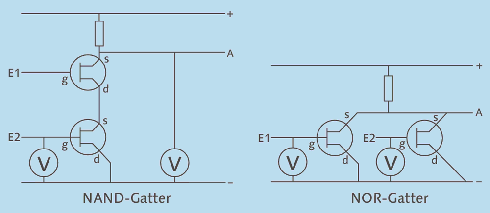 Abbildung 2.6 zeigt, wie die NAND- und die NOR-Schaltung durch zwei Transistoren und einen Widerstand realisiert werden.