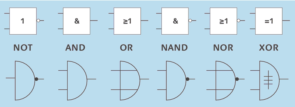 Abbildung 2.7 Gattersymbole der Logikschaltungen – oben die aktuelle DIN-Norm, unten die traditionellen Symbole
