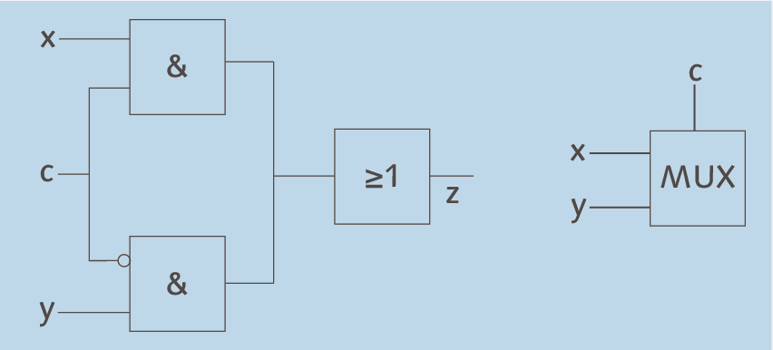 Ein Beispiel für die Verknüpfung mehrerer einfacher Gatter ist der Multiplexer. Er implementiert eine einfache Wenn-dann-Beziehung: Wenn der Steuereingang c mit einer Spannung belegt ist (Wert 1), wird der Wert des Eingangs x durchgeschaltet, andernfalls der Wert des Eingangs y. Abbildung 2.8 zeigt den schematischen Aufbau des Multiplexers, daneben sein Schaltsymbol. Die schrittweise Zusammenfassung immer komplexerer Schaltungen durch neue Symbole ist eine wichtige Voraussetzung für die effiziente Arbeit bei der Entwicklung elektronischer Bauteile.