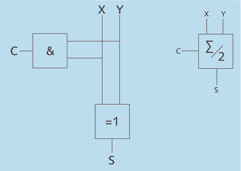 y. Abbildung 2.9 zeigt den Aufbau des Halbaddierers und sein Schaltsymbol.