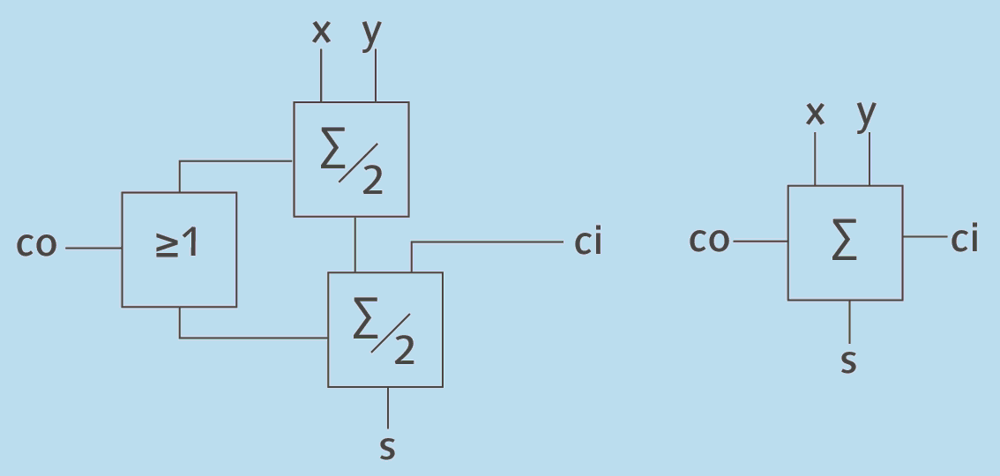 Der Volladdierer enthält zwei Halbaddierer. Die einstellige Summe setzt sich aus der Summe der beiden eigentlichen Summanden x und y und aus dem hereinkommenden Übertrag ci (Carry-in) zusammen. Der ausgehende Übertrag co (Carry-out) wird durch die Oder-Verknüpfung der beiden Summen gebildet. In Abbildung 2.10 sehen Sie den Aufbau des Volladdierers und sein Schaltsymbol.