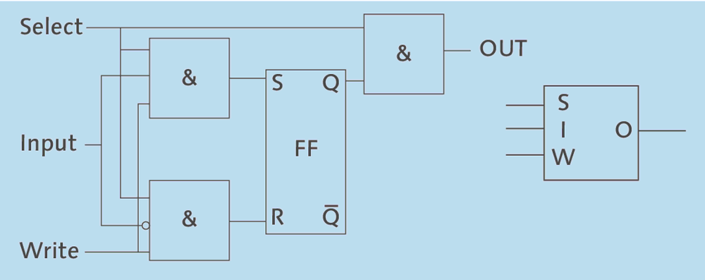 Abbildung 2.13 zeigt den Aufbau einer Speicherzelle, die die beschriebene Funktionalität zur Verfügung stellt, sowie ihr Schaltsymbol. Wenn auf SELECT eine 1 eingegeben wird, kann über den mit Q AND-verknüpften Ausgang OUT der aktuelle Wert gelesen werden. Dieser Mechanismus dient in einem großen Gefüge von Speicherzellen der Adressierung, also der Auswahl einer bestimmten Speicherzelle oder einer Gruppe von Speicherzellen. Werden SELECT = 1 und WRITE = 1 gesetzt, wird der an INPUT anliegende Wert auf die beschriebene Weise im Flip-Flop abgelegt.