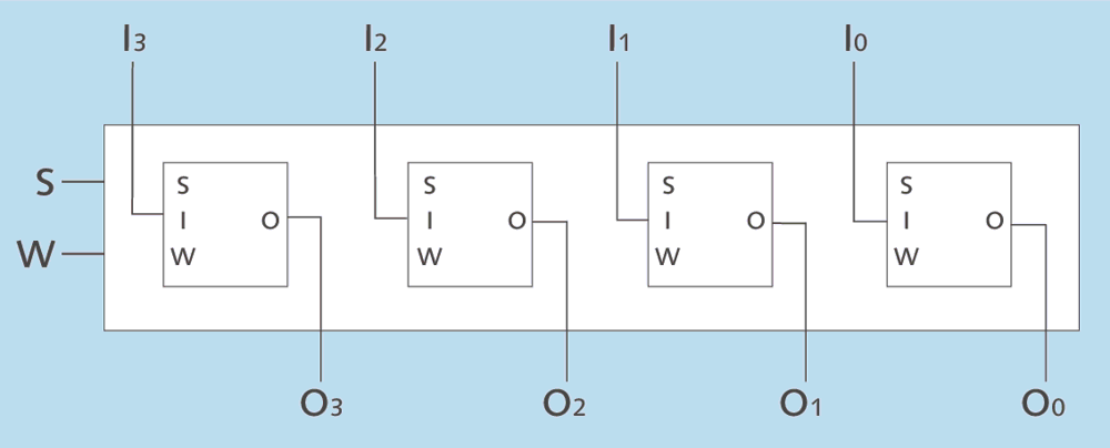 Mehrere Speicherzellen lassen sich zu einem Register zusammenschließen. Dazu werden die SELECT- und WRITE-Eingänge aller beteiligten Zellen zusammengeschlossen, da stets das gesamte Register auf einmal gelesen oder geschrieben wird. Auf diese Weise werden die Rechenregister im Mikroprozessor realisiert, aber auch die adressierbaren Speicherblöcke im Arbeitsspeicher (RAM). Abbildung 2.14 zeigt ein Beispiel eines 4-Bit-Registers. In der Praxis sind die meisten heutigen Register 32 oder gar 64 Bit breit, funktionieren aber nach demselben Prinzip.