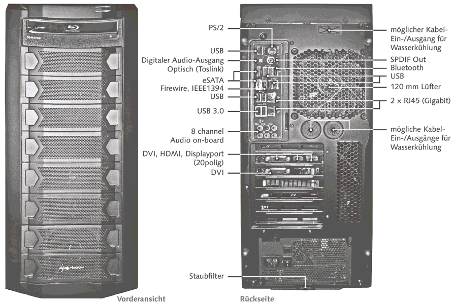 Abbildung 3.2 zeigt die Vorder- und die Rückseite eines gut ausgestatteten modernen Desktop-PCs. Auf der Vorderseite erkennen Sie oben ein Blu-ray-Laufwerk, das natürlich auch DVDs und CDs verarbeiten kann. Auf der Geräterückseite finden Sie zahlreiche Anschlüsse. Links oben liegen die verschiedenen Buchsen der Onboard-Komponenten: mehrere USB- und USB-3.0-Anschlüsse, FireWire, eSATA, zwei Gigabit-Ethernet-Anschlüsse, Audio und so weiter. Unten sind die nach außen geführten Anschlüsse der Einsteckkarten zu finden, vor allem eine Grafikkarte mit DVI-, HDMI- und Displayport-Anschlüssen.