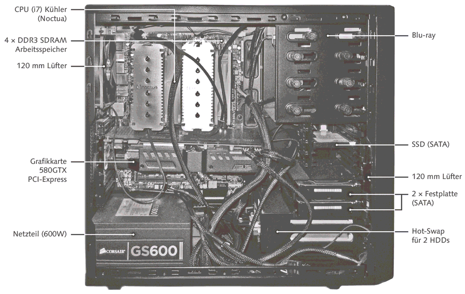 In Abbildung 3.3 sehen Sie das Innenleben desselben Rechners. Auch hier wurden die verschiedenen Komponenten im Bild beschriftet, um das Ganze übersichtlicher zu machen. In den folgenden Abschnitten werden die einzelnen Bestandteile genauer beschrieben.