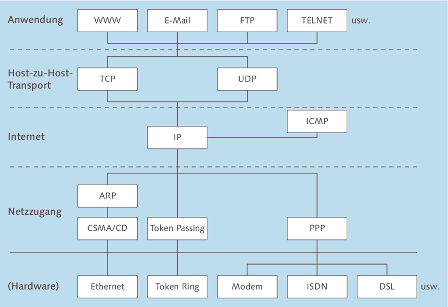 Die unterste Ebene des Internet-Schichtenmodells ist der Netzzugang, nicht die Netzwerkhardware. Dies garantiert, dass sich die Internetprotokolle auf fast jeder beliebigen Hardware implementieren lassen, und in der Tat ist dies geschehen: In allen Formen von LANs wie Ethernet oder Token Ring, in WANs über Wähl- und Standleitungen wie auch über die meisten Formen von drahtlosen Netzen – überall laufen diese Protokolle. Dies ist ein weiterer guter Grund dafür, dass sich die Protokolle des Internets als Standard für die Netzwerkkommunikation durchsetzen konnten.