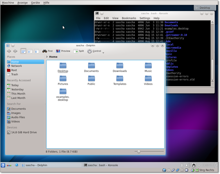 In Abbildung 7.7 sehen Sie einen KDE-Desktop mit geöffneten Fenstern des Terminalprogramms KDE Konsole und des Dateimanagers Dolphin.