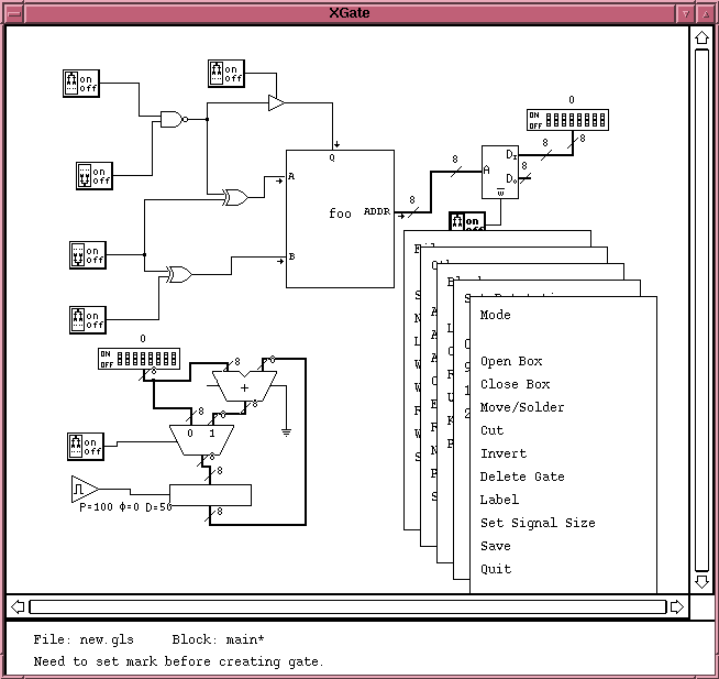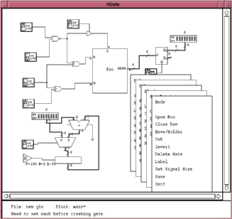 After laying dormant for several years, it was resurrected in 1991 and ported to run under X11 with the Xlib API. A screenshot of this version, which was called "xgate", is shown in Figure 1.1. In this incarnation it was used several times by students in the introductory digital logic course, but after the author graduated and left CMU, it went into hibernation again.