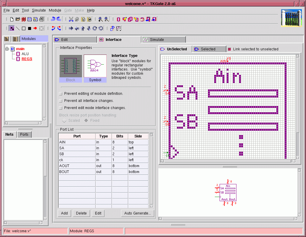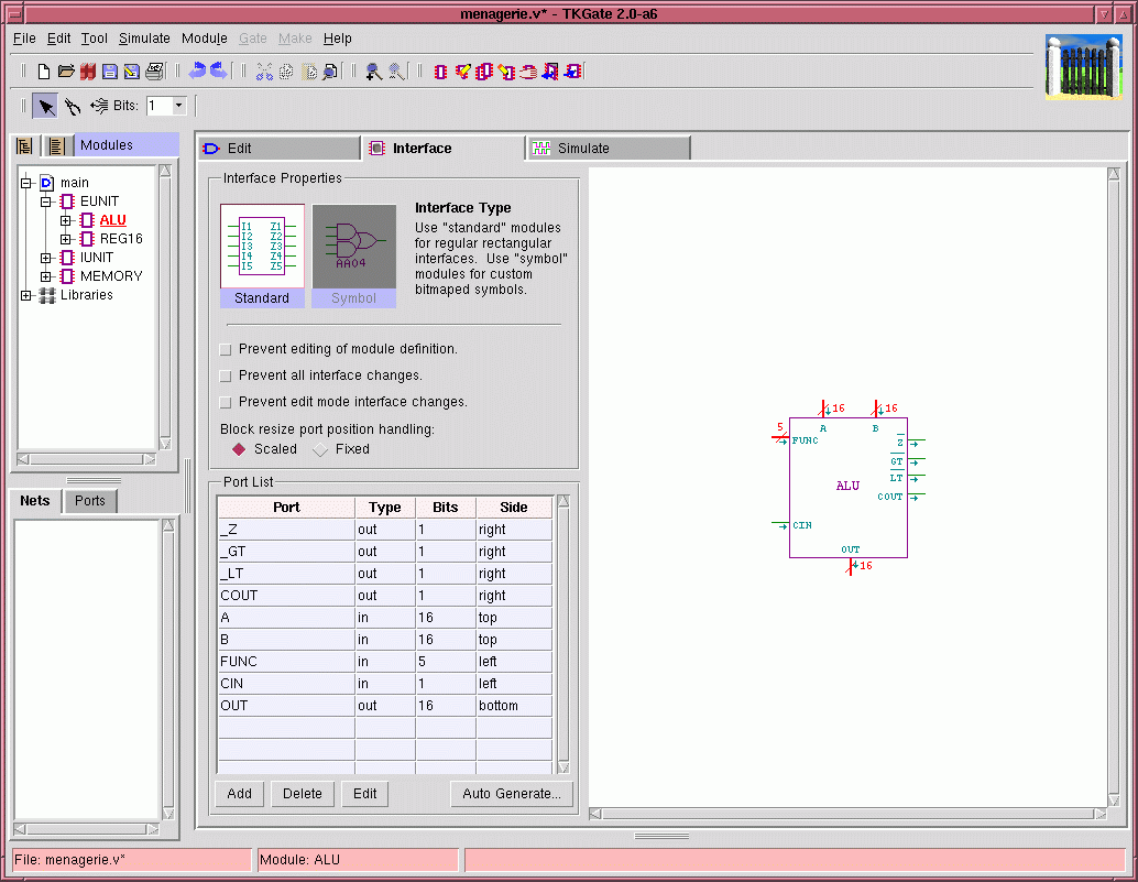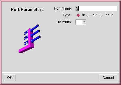 To add a new port, you can either double click on the next empty line in the port list, or press the "Add" button. TkGate will attempt to guess an appropriate name for the new port, but you can type in your own name if you prefer. To delete a port, select it and press the "Delete" button.
