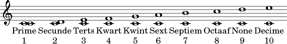 Je vindt de algemene naam door het aantal stappen op de notenbalk te tellen, de voortekens daarbij negerend. Het interval van E naar G# wordt dus aangeduid met de algemene naam derde omdat we drie stappen tellen (E F G).