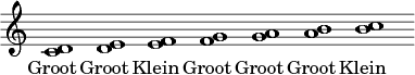 Secunden leer je herkennen door eerst te leren welke secunden er tussen de natuurlijke tonen liggen. Zoals je kunt zien in Afbeelding 3.1, zijn alleen de intervallen E-F en B-C kleine secunden. De rest zijn grote intervallen. Je kunt nagaan dat Afbeelding 3.1 klopt door naar een piano te kijken. Daar zul je zien dat er geen zwarte toetsen tussen E-F en tussen B-C zitten.