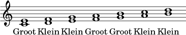 Een kleine terts bestaat een kleine en een grote secunde, of drie semitonen. Een grote terts bestaan uit twee secunden, of vier semitonen. Afbeelding 3.5 toont de tertsen tussen alle natuurlijke tonen. Je moet de grote intervallen C-E, F-A en G-B onthouden. Je weet dan dat de andere vier intervallen klein zijn.