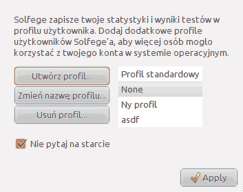 Menedżer profilów umożliwia korzystanie z Solfege'a wielu użytkowników, korzystającym z tego samego konta w systemie operacyjnym. Profile mają ten sam plik konfiguracyjny, ale oddzielne statystyki i wyniki testów.