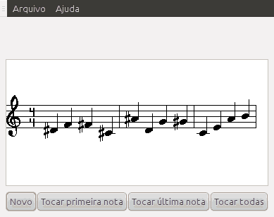 Neste exercício, o programa mostrará todas as doze notas da escala em uma ordem aleatória e tocará a primeira. Então você deve cantar todas e verificar se a última se encaixa. Então isso mais parece com um exame de leitura e canto do que um exercício para aprender a cantar intervalos. Para isso você deve tentar alguns dos outros exercícios de intervalos.